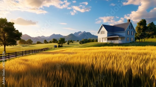 Farmhouse standing in a wheat field at sunset with mountains in the background