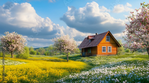 farmhouse surrounded by blooming apple trees, with soft clouds in the sky and vibrant green grass