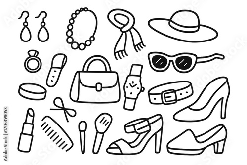 fashion, accessory, doodle, hand, drawn, illustration, earring, necklace, foulard, sunglasses, hat, pursed, bracelet, ring, watch, belt, shoe, lipstick, comb, hairpin, make-up, brush, simple, cartoon, style, black, line