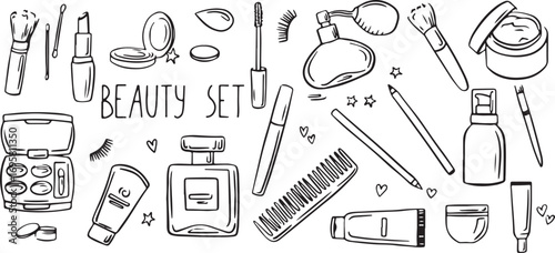 fashion, accessory, doodle, outline, bag, perfume, eyewear, make-up, beauty, clip art, hand-drawn, black-and-white, minimal, vector, vignetting, glamour, style, modern, icon, symbol, isolated, line art, drawing, chic, element, design, white background, trendy, feminine, set, illustration, tool, music, screw, collection, art, pattern, musical, equipment, construction, wrench, vintage, hammer, work, instrument, icon, nut