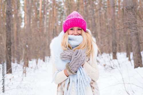 Fashion and people concept - Portrait of attractive young blonde woman dressed in white coat and pink hat in winter snowy park