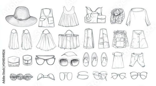 fashion, design, vignetting, clothing, apparel, accessory, eyewear, sunglasses, hat, dress, blouse, skirt, pant, bag, shoe, flats, jewellery, foulard, top, short, summer, style, trend, illustration, drawing, outline, monochrome, graphic, woman, girl, collection, textile, garment, pattern, look, clothes rack, outfit, elegant, casual attire, chic, pretty, hand-made, beautiful, artistic, creative