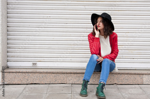 mobile, smartphone, girl, phone, cellular, fashion, hipster, lifestyle, technology, roam, talking, greeting, conference, conversation, young people, jean, casual attire, sport, caucasian, styling, urban, street, red, jacket, fur