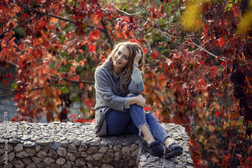 Fashion model wearing ripped boyfriend jeans, jacket and sneakers posing in the city