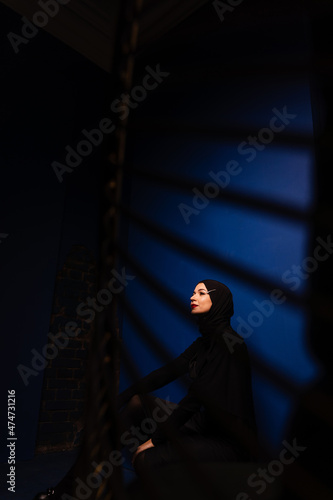 Fashion muslim model in black hijab is posing on blue background in studio. Islam religion creative photo
