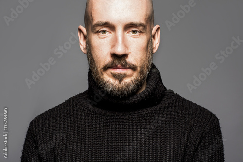 Fashion Portrait of a 40-year-old man standing over a light gray background in a black sweater. Close up. Classic style. Bald shaved head. Copy-space. Studio shot