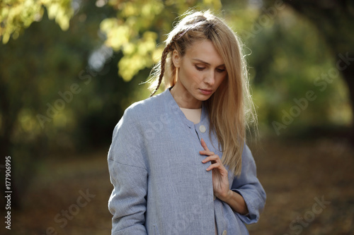 Fashion portrait of beautiful blonde woman in stylish clothes outdoor in autumn.