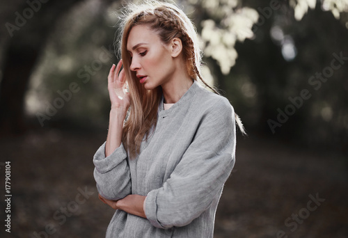 Fashion portrait of beautiful blonde woman in stylish clothes outdoor in autumn.