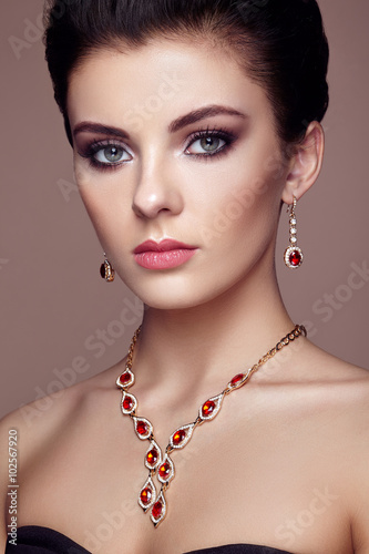 Fashion portrait of young beautiful woman with jewelry. Brunette girl. Perfect make-up. Beauty style woman with diamond accessories