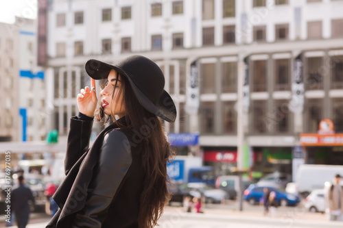 Fashion portrait of young elegant model wears wide-brimmed hat. Lady posing on a background of city