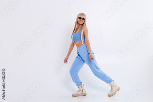 well-being, stomach, fitness, studio, gym, trend, clothing, wall, fashion, female, shape, catalog, clothes, body, walk, active, pose, attractive, model, adult, sexy, wig, smile, natural, gold, grey, isolated, 1, white, beautiful, copy space, full, abs, sport, fit, slim, boot, caucasian, stylish, jump, fun, pretty, girl, glamour, coiffure, face, style