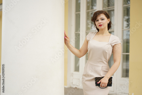 fashion portrait of young woman in classic pinup beige dress outdoor in the city