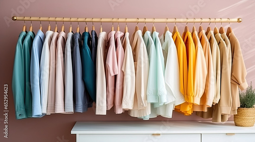 Fashion stylish luxury clothes display. Image and stylish services, selection of colors, types. Capsule spring wardrobe