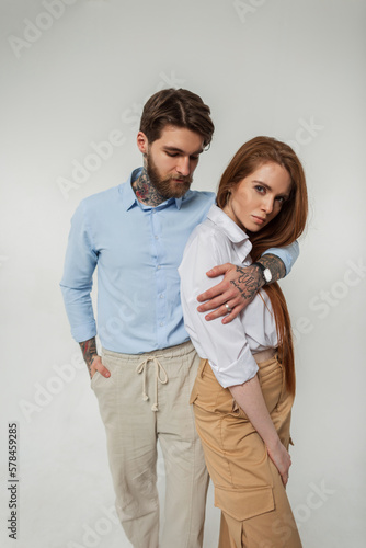 Fashionable beautiful lovers couple pretty redheaded girl and hipster guy with a tattoo and beard in stylish clothes with a shirt on a white background in the studio