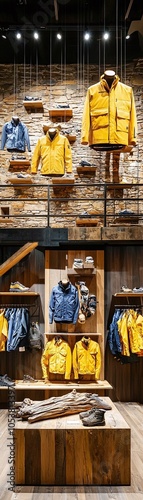 fashion, jacket, shoe, store, retail, display, clothing, apparel, footwear, style, trend, contemporary, modern, design, interior, shop, boutique, luxury, brand, product, sale, purchase, client, shopping, consumerism, mannequin, hanger, wooden, rack, shelf, lighting, light, stone wall, wood, rustic, vintage, industrial, urban, commercial, business, marketing, merchandise, window, lifestyle