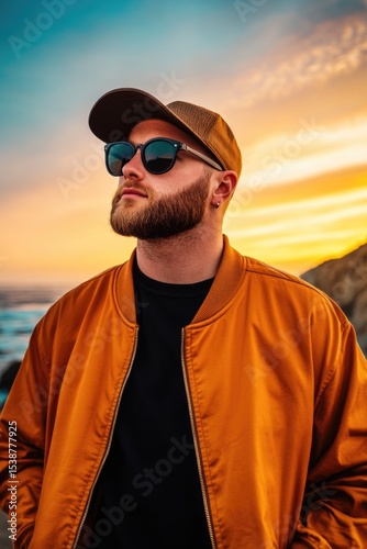 male, sunglasses, hat, beard, jacket, sunset, ocean, landscape, fashion, modern, casual attire, confident