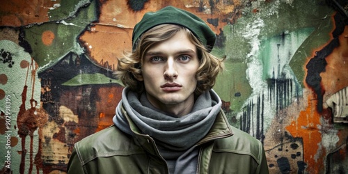man, portrait, fashion, model, style, clothing, male, face, eye, hair, green, beret, jacket, foulard, urban, street, wall, graffiti, art, city, cool, casual attire, trendy, photogenic, attractive, look, pose, studio, photo, lighting, closeup, expression, person, human, young, adult, beard, necklace, earring, moustache