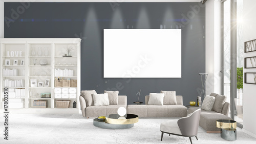 Fashionable modern loft interior with empty frame and copyspace in horizontal arrangement. 3D rendering.