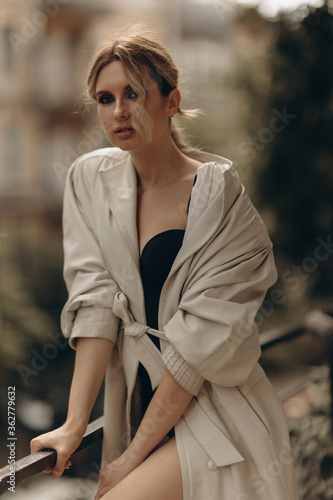 Fashionable portrait of a stylish blonde woman in elegant totall beige look leather trench coat and smoky eyes makeup in the outdoor. Spring - autumn fashion concept. Soft selective focus.