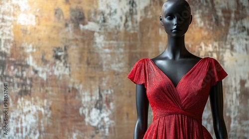 Fashionable red mannequin dressed in an elegant evening outfit, set against a stylish backdrop with no people.
