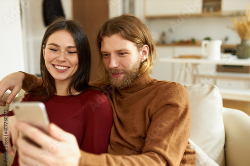 phone, woman, man, home, couple, sofa, mobile, happy, house, young, couch, male, cheerful, female, cyberspace, holding, people, caucasian, 2, leisure, technology, lifestyle, human relationships, together, sitting, browsing, looking, fun, communication, mobile phone, entertainment, device, video, app, showing, hugging, connection, wireless, online, comfortable
