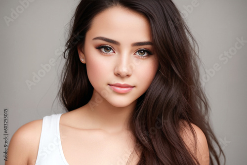 young, beautiful, woman, model, long hair, grey background, youth, fashionable, style, fashion, modern, contemporary, chic, elegance, graceful, stylish, attractive, pretty, gorgeous, stunning, portrait, femininity, glamour, seductive, sensual, posh, sophisticated, urban, cosmopolitan, casual attire, denim, leather, accessory, sunglasses, minimalism, simplicity, natural beauty, confident, empowered, ai, generative