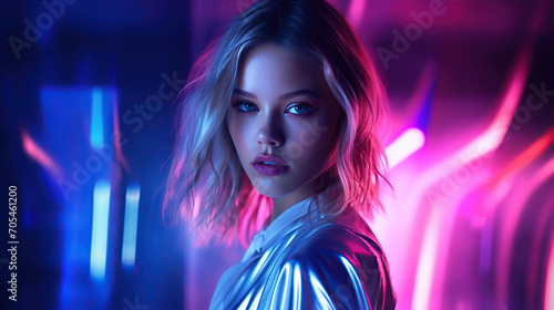 fashionable young woman stands confidently against a backdrop of intense neon lights