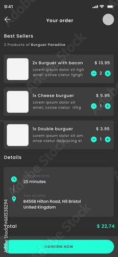 Fast Food and Hamburguer take away , delivery food, Burguer Restaurant Black App Ui Kit Dark Template