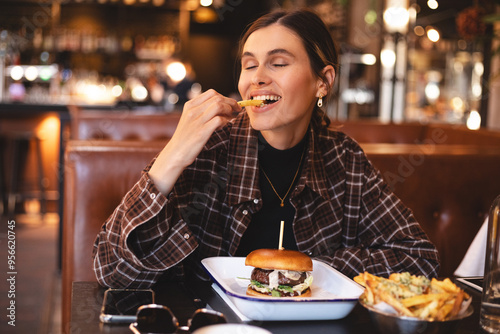 Fast food lover. Happy lady eating burger and french fries, biting potatoes and closed eyes, sitting in restaurant. Playful woman holding french fries, burger in plate and tasty. Cheat meals.