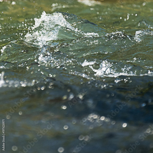 Fast mountain stream splashing and flowing over rocks on a bright sunny day