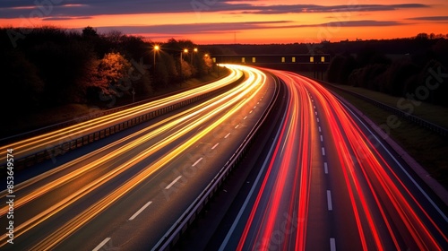 night, traffic, highway, sunset, light, trail, car, long, exposure, streak, asphalt, road, dark, evening, landscape, urban, speed, movement, blur, motion, dynamic, abstract, line, pattern, colours, warm, orange, red, yellow, gold, sky, cloud, horizon, tree, silhouette, bridge, overpass, background, image, illustration, photo, wallpaper, structure, long exposure, travel, transportation, white, expressway