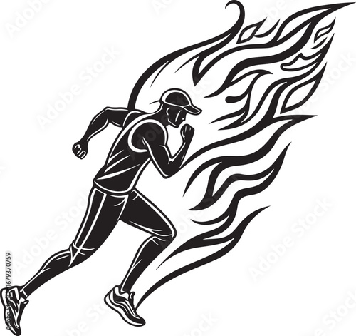 "Fast Runner Vector Illustration with Flames, Sprint Athlete Silhouette, Speed Running Graphic Design