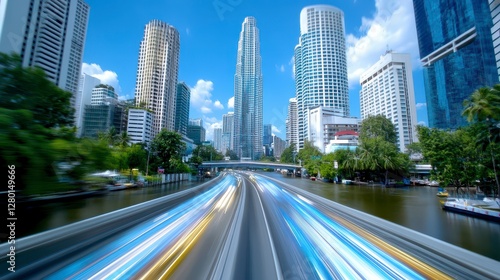 city landscape, highway, canal, building, highrise, greenery, urban, motion, blurred, car, light, tree, sunlight, daytime, asia, siam, modern, architecture, fast, scene, city, life, street, view, road, transportation, travel, vehicle, blur, light, trail, bright, colourful, photo, photo, image, picture, beautiful, amazing, skyscraper, landscape, nature, side, traffic, center