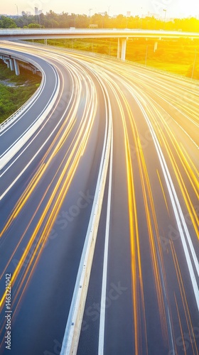 highway, road, traffic, speed, motion, blur, asphalt, lane, infrastructure, transportation, sunrise, summer, travel, adventure, dynamic, energy, fast, flowing, bright, warm, optimistic, future, progress, connectivity, modern, urban, landscape, city landscape, technology, innovation, seamless, smooth, clean, efficient, powerful, streamlined, directional, perspective, line, gold, radiant, vibrant, swift, acceleration, distance, journey, expansion