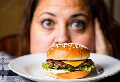 Fat and obese hungry woman is looking on tasty hamburger on a plate. Overweight, obesity and dieting concept.