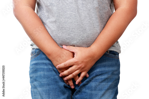 Fat men wear gray shirts and are overweight. have health problems and problems with sexual dysfunction and are at risk of developing various diseases. weight loss concept. isolated. Clipping Path