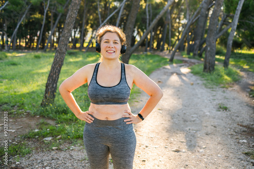 woman, fat, physical exercise, jogging, overweight, portrait, exercise, loss, weight, park, lifestyle, fitness, adult, beautiful, happy, activewear, cardio, outdoors, people, female, large, runner, body, hispanic, health, active, training, size, sport, corpulent, curvy, oversize, yoga, girl, plus, chubby, healthy, burn, fats, model, jogger, activity, attractive, wellness, young, fit, earphones, run