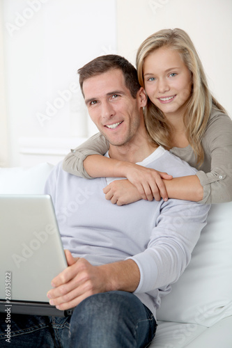 family, man, girl, father, daughter, blond, smiling, portrait, closeup, single parent, computer, laptop, cyberspace, generation, technology, websurfing, education, relaxed, happy, complicity, long hair, caucasian, indoor, beautiful, pretty, beauty, adult, children, blue eye, sofa, home