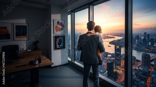 Father and Child Enjoying a Panoramic City Sunset View from Modern Office
