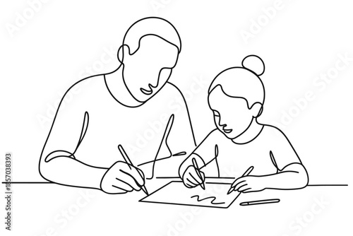line art, minimalist, education, learning, creativity, family time, togetherness, childhood, parenting, artistic, illustration, simple, drawing, sketching, activity, hobby, leisure, home, indoor, children, children, adult, man, woman, girl, people, human relationships, bonding, support, guidance, concentration, sharpened, table, paper, art supply, hand drawing, outline, vector, black-and-white, studio, domestic life, art class