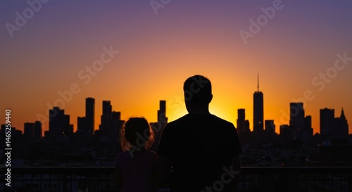 Father and daughter gazing at the breathtaking cityscape silhouette at sunset, creating a precious family memory against the backdrop of urban beauty