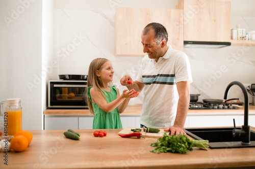 children, kitchen, food, cooking, home, vegetable, diet, healthy, cook, vegetable, smile, person, drink, cutting, people, smiling, eating, knife, fresh, pepper, fruit, salad, lifestyle, interior, breakfast, father, daughter, girl, indoor, playing, laughing, enjoying, man, juice, orange, tomatoes, cucumber, funny, fun, have fun, fathers day, mother's day, care, love, family, single