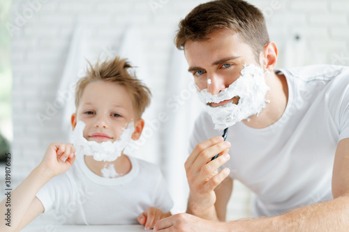 hand, man, happy, togetherness, showing, foam, children, cream, eltern, portrait, father, children, son, father, smile, shave, instructing, together, t-shirt, soap, caucasian