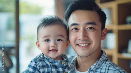 Father and smiling baby boy in warm home interior, family bond, parent-child relationship, fatherhood joy, baby’s first steps, happy moments, young father