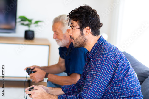 Father and son family time together at home concept. Happy father and son enjoy playing video games with joysticks in living room at home