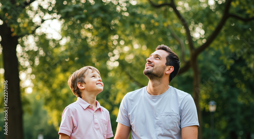 Father and son looking up together in sunny park. Light blue t-shirt, pink polo shirt, lush green trees. Summer family curiosity bonding concept