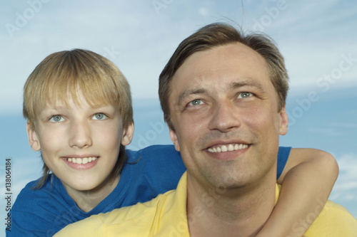 summer, adult, background, blue, boy, care, caucasian, cheerful, childhood, children, closeup, father, european, family, father, friends, glad, guy, happy, health, hug, human, joy, junior, children, love, male, man, natural, nature, optimistic, outdoors, outside, eltern, people, person, portrait, positive, recreation, relax, rest, sky, smile, son, together, 2, white, yellow, young, youth