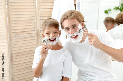 adult, appearance, background, bathroom, bonding, boy, brush, care, caucasian, children, childhood, cream, father, family, father, fatherhood, foam, friendship, fun, funny, game, happy, home, hygiene, indoor, children, lifestyle, little, male, man, mirror, morning, eltern, people, play, playing, portrait, positive, preteen, razor, routine, shave, shaving, silly, skin, smiling, son, together, tween, young