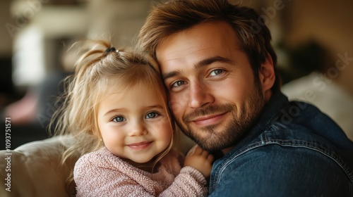 Father and young daughter indoors, close-up smiling, denim jacket, bonding moment, family portrait, cozy home, parental love, happiness, parent and child