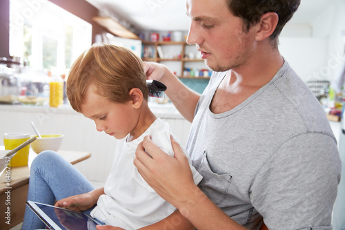 family, father, son, home, brushing, hair, hairbrush, eating, breakfast, bowl, touch screen, technology, playing, sitting, table, morning, indoor, children, children, male, man, man, two people, person, people, caucasian, 20s, 20s, horizontal, kitchen, food, meal, eltern, happy, smiling, having fun, enjoyment, laughing, together